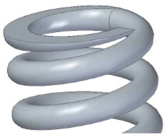 In this article, we are in the case of a freely oscillating coil. In the case of several coils joined together, it would be necessary to consider the ligatures of their ends as shown in Figure 7 for the end of a squared and ground spring. That is to say, with a helix angle of zero degrees and a flat seat, which allows a better load transfer. The assembly thus defined becomes an oscillatory mode in which the spring as a whole adopts the barrel configuration. Pearson [23] studies the important contribution of the ends to the calculation of the spring natural frequencies.