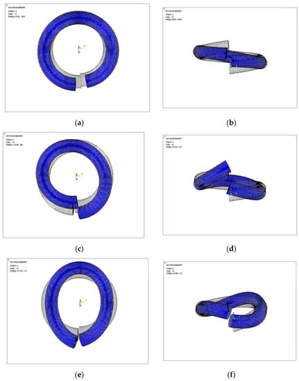 In all cases, the corresponding oscillation modes are studied. Table 2 shows the results. Columns 4 to 9 show the frequency and the mode of vibration. Essentially, the first mode corresponds to an opening between ends, such that the original helix is transformed into an ellipsoidal helix (Figure 8a). In this case, the predominant deformation of the helix is bending. The second mode corresponds to the relative motion between these ends (Figure 8b) but preserves the circumference of the helix, which corresponds to a mode in which the torsional effect of the helix is more predominant than its bending. In this second case, the pitch of the coil would increase significantly.