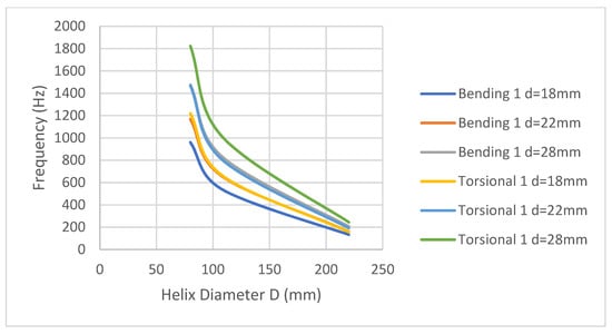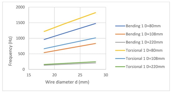 Proceeding analogously for the first bending mode, the wire thickness is now kept constant, and the average diameter of the helix is varied (Figure 10). The frequencies decrease as the helix diameter increases. Moreover, as the wire diameter increases, the resonant frequency increases. The situation is repeated for the first torsional mode of vibration. It is a situation analogous to that of the previous paragraph.