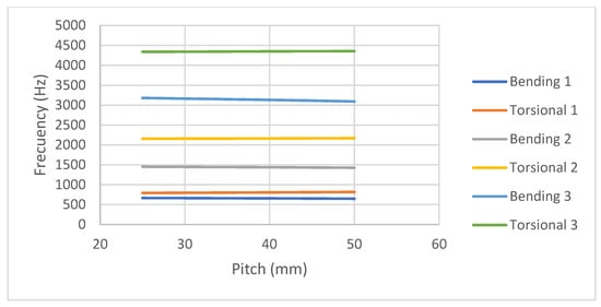 It has also been considered whether the pitch of the spring can be an influential design parameter when calculating resonances. Figure 11 shows that the pitch variation does not affect the frequencies. Figure 11 shows the different modes obtained and commented.