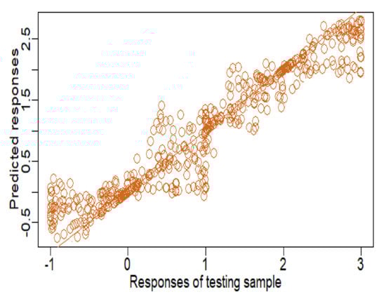 In this paragraph, we apply the GNFPLSIM model for Tecator data, popularly known in the functional data analysis. These data can be downloaded in the following link http://lib.stat.cmu.edu/datasets/tecator (accessed on 1 March 2022). For more details, check Ferraty and Vieu [12].