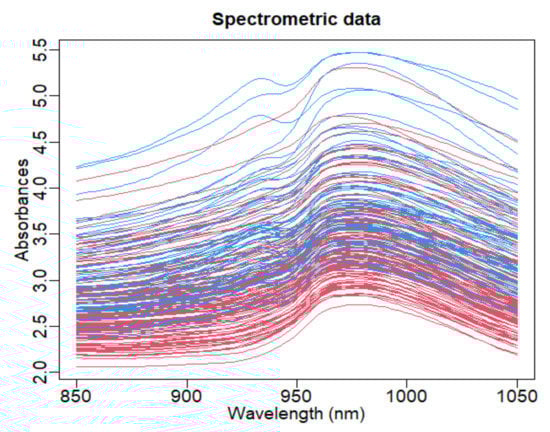 Given 215 finely chopped pieces of meat, (see Figure 5) Tecator’s data contain their corresponding fat contents (), near-infrared absorbance spectra () observed on 100 equal wavelengths in the range 850–1050 nm, the protein and the moisture content .
