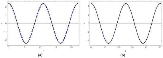 To prove the correctness of the analytical solutions (15) and (20), they are compared with the numeric solution of (5) and (18), respectively. The numeric solutions are obtained by applying of the Runge–Kutta procedure. In Figure 1, the analytic and numeric solutions for a = 5 kg/m, b = 0.5 kg/m, F = 4 N, initial conditions , and α = 3, k = 0.5 N/mm4 (Figure 1a) and α = 1, k = 0.5 N/mm2 (Figure 1b) are plotted. It is found that the analytic solutions are on the top of the numerical ones.