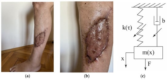 In Figure 2, the grafted skin on the leg and its physical model are shown. The grafted skin is settled in a certain position on the body and has to be joined with the already existing skin of the human. This process needs time, which depends on variations of the skin properties and on forces which act on the grafted skin. The force which acts along the leg during human motion causes the effect of grafted skin deformation, i.e., its compression and elongation. Motion of the grafted skin becomes oscillatory.