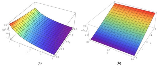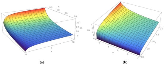 In Figure 5, the influence of mass variation parameter and rigidity coefficient on the amplitude (a) and frequency (b) of vibration is considered. Namely, the A0-k-a (Figure 5a) and ω0-k-a (Figure 5b) diagrams are plotted for constant α = 3, F = 1N and a/b = 0–20. The amplitude varies in the interval A0 = (0–3) mm, the frequency = (0–4) s−1 and k = (0–2) N/mm4. It is shown that the amplitude of vibration decreases with k: if the added mass is larger, the amplitude of vibration is higher and decreases slower than for small added mass. However, it is seen that the amplitude of vibration is almost constant in the interval a = (1–10) kg/mm for k = (1–2) N/mm4. In addition, the frequency of vibration is almost constant for a = (5–10) kg/mm and k = (0.5–2) N/mm4. For small added mass the influence of k on the frequency is more significant than for a large mass quantity.