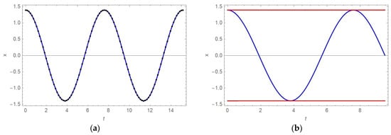 Using (7), (13), (14) and (16), the amplitude of vibration, frequency and period of Ateb function and the period and frequency of vibration are for α = 3: A = 2.4265 mm, ω = 0.95175 s−1, 2Π = 10.4882, T = 11.020 s and Ω = 0.57017 s−1. According to (20), amplitude, frequency and period of vibration for α = 1 are ω = 0.25 s−1, . Comparing Figure 1a,b, the influence of the order of nonlinearity α is evident. For a higher order of nonlinearity, the amplitude of vibration and the period of vibration are smaller, while the frequency of vibration is higher than for low values of α.