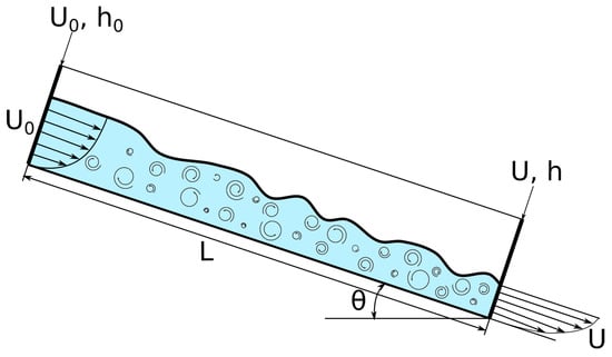 Three series of experiments were performed; the initial flow profile, the initial flow depth, the slope angle were varied as shown in Table 1 [64], where is the depth-averaged velocity, is the flow depth, is the slope inclination angle.