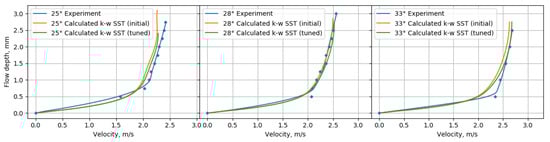 A section of the experimental chute located between two velocity profile and flow depth measurement points was simulated. The simulations were performed for the thick 10 mm part of the chute where the influence of the side walls was small. The first measured profile was used for the input data for the computational domain. The second one was the object of comparison. The parallelepiped with a size of 590 mm in length, 10 mm in width, and 10 mm in height was used for the numerical domain. We tested the effect of grid resolution. Grid convergence was studied for various grid sizes of , , , and . For each run, the output velocity profile was compared with the experimental one using the loss function (5). The values of the loss functions for the last three mesh sizes varied within 0.1%. Therefore, the number of cells was chosen to be for reasons of reducing computer time while maintaining accuracy.