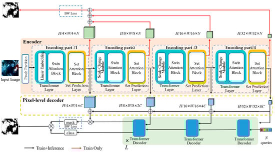 As shown by the red line in Figure 1, a lightweight upsampling decoder is used to aggregate the four scales of the Set Prior mapping in order to obtain the Set Prior mask prediction and to supervise it using binary mask weighted loss function (BW Loss) to assist in the training of the whole network. In addition, the Set Prediction layer also gives mask features, which are fed into the Transformer hierarchical decoder in order from lowest to highest resolution, using Feature-aligned Pyramid Network (FaPN) [21] as a pixel-level decoder for resolution reconstruction.