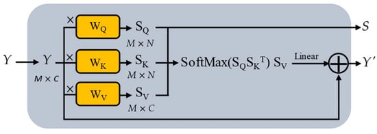 The Set Prediction layer takes the features extracted by the Transformer layer as input and maps the features to the set space using Set Attention Block with the aim of generating set mask predictions. Set mask prediction is an intermediate feature. By fusing these intermediate features with a pyramid structure and restoring them to the resolution of the original image, a preliminary prediction can be obtained. This prediction is not very accurate. However, they contain the intermediate features of the loss of the final prediction results, so using it to guide the update of weights in the network will help the network converge faster and more stably. In addition, the Set Prior Prediction process only occurs in the training stage. Therefore, such a strategy will not affect the reasoning speed of the final network. Set Attention Block is computed with a single-headed set attention. As shown in Figure 2, Set Attention Block to divide the input features Y into three individuals using the parametrically learnable linear layers WQ, WK and WV: the set query SQ, the set key SK and the feature values SV. The dimension of SV is M × C, where M is the length of the sequence in each window, C is the number of windows. The dimensions of SQ and SK are M × N, respectively, where N is equal to the number of queries set in the Transformer decoder. In this article N is set to 100 as in Cloudformer. SQ returns a priori set predictions, and SQ and SK act together to update SV to acquire Y’ to pass to the next stage. Set attention process is as follows: