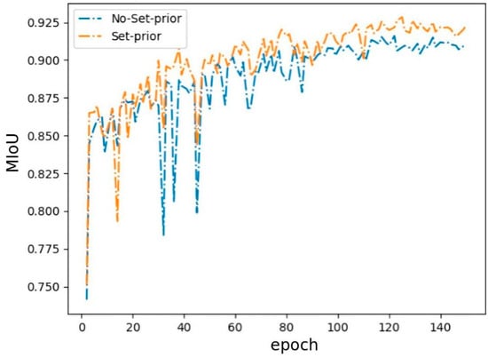 The training is carried out in two ways while keeping the rest of the structure the same. One way is to keep the structure in Figure 1 and train it. The other way is to discard the red arrowed part in Figure 1 and no longer separate the Set Prior Predictions from the Set Prediction layer to aid training. In Figure 4, the trend of MIoU for the two training ways is shown. It is clear that Set Prior Prediction improves training efficiency.