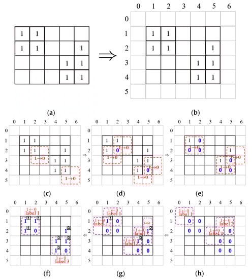 Phase 3 Label propagating: As mentioned before, label propagating is a reverse-order process, so Equations (3) and (4) are applied for the same number of times as Phase 2. The process order is indicated in Figure 2f–h using the left arrow, and the purple dotted boxes are used for marking the label change. In Figure 2h, , , and  are labeled with different numbers based on (3) at the same time. We use the row–column criterion to label the pixels. In Figure 2f, serial numbers of the pixels that have been labeled are represented in the upper left corner box, , , ,  need new labels based on Equation (3), and  needs a change of the labeled number based on Equation (4) to keep consistent with ’s  neighbors. In Figure 2f, the last two pixels,  and , are labeled, which means that label propagating is finished, and two different label numbers are obtained.