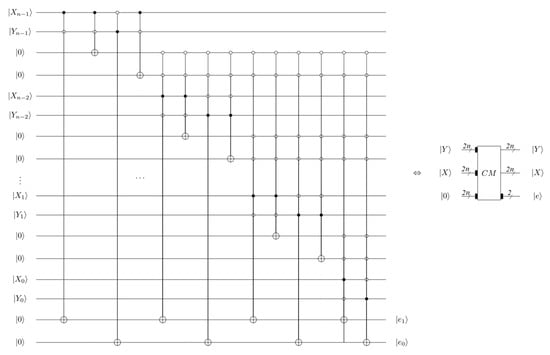 The compare operation circuit can be used to compare two n-qubits sequences  and  illustrated in Figure 7 [], where , , , . The output two-qubit  can be used to represent the result of comparison: if , then ; if , then ; if , then .