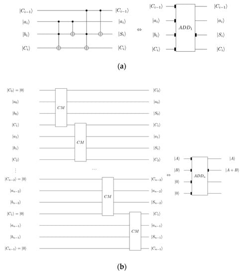 Full adder is an adder with carry, a common arithmetic unit in various algorithms. In this paper, 1-bit full addition circuit is composed of quantum CNOT and CCNOT gate, and n-bit full addition circuit is a cascade of 1-bit full addition circuit as shown in Figure 8 [].  is the th carry qubit,  is the th augend number,  is the th addend number,  is the th carry qubit, and  is the sum of . The relationships among , , ,  and  are given by