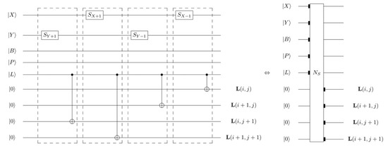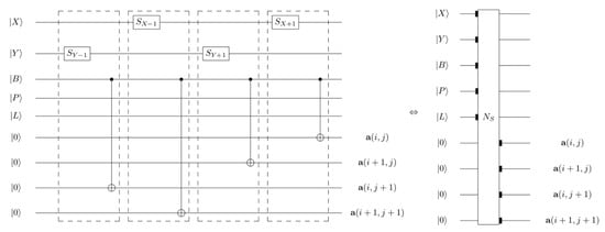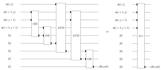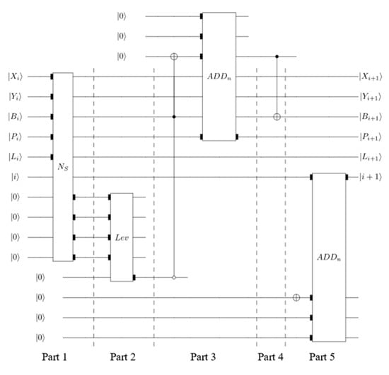 The third step, the number of partial results, is stored in  through the full addition circuit, and the designed circuit is shown in Part 3 of Figure 12. If  and , then . Fourthly, the value of pixels  is updated through CNOT gate (Part 4 of Figure 12). Finally, the number of loops  through the full addition circuit is shown in Part 5 of Figure 12. The circuit of Equation (2) is shown in Figure 12.