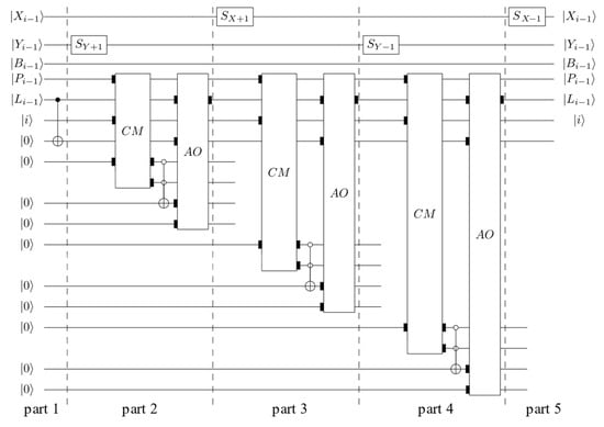 In the fourth step, Equation (4) is implemented through the designed circuit shown in Figure 16.  is stored in ancilla qubits using CNOT gate in part 1. In part 2,  is obtained using address shift operator , the condition of  is realized using comparer CM, and then equation  is implemented using control assignment operator AO. Part 3 and part 4 use the same circuits as part 2 to achieve the same assignment function. In part 5, the initial state is restored.