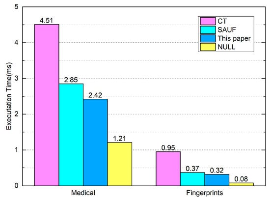 In the experiments, the library Boost.python is used for Python calling C++, and the quantum image component labeling algorithm is compared with CT [] (Contour Tracing approach), SAUF [] (Scan plus Array-based Union-Find algorithm), and NULL, which are three classical component labeling types in YACCLAB. The NULL is a fake algorithm that performs the basic assignment operation defining a lower bound limit of the execution time. The experimental results (Figure 17) show that the proposed algorithm is better than the two classical algorithms, and the execution time is the average time for labeling on the image dataset.