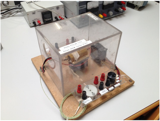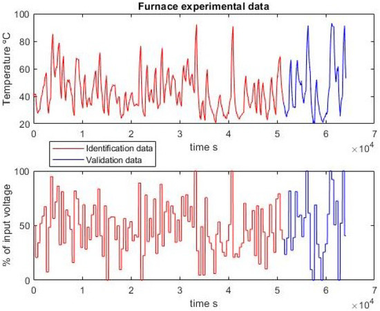 The experimental data are collected from a model furnace used in a lab. It is formed by a power resistor within a plastic box equipped with a fan (see Figure 2). The manipulated variable is the percentage of energy supplied to the resistor, which depends on the applied input voltage. The fan is kept at a constant speed for our experiments. The temperature within the box is measured using a K-type thermocouple calibrated for a temperature range [−50, 250] °C. The system is nonlinear, the gain depends on input amplitude and, besides, it is not the same to raise the temperature or lower it. For control purposes, it is considered to be well approximated by a first-order LTI model. These systems usually have a pure time delay, which is almost negligible in this model.
