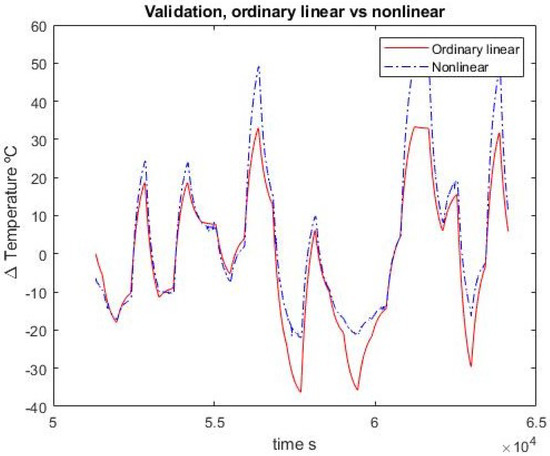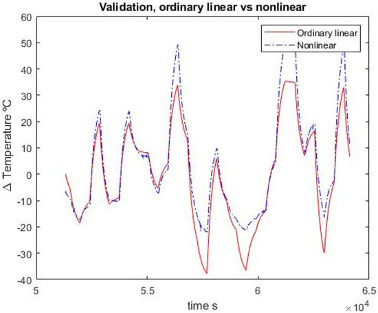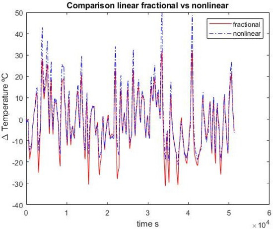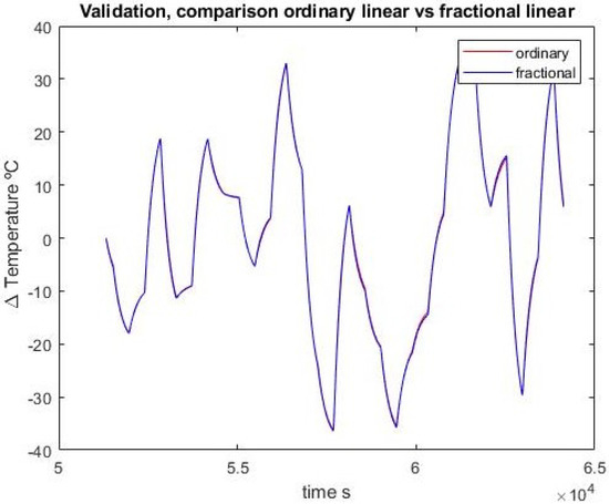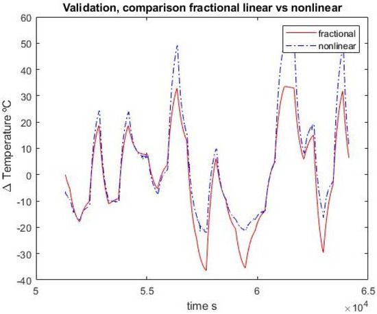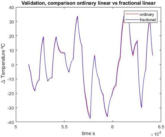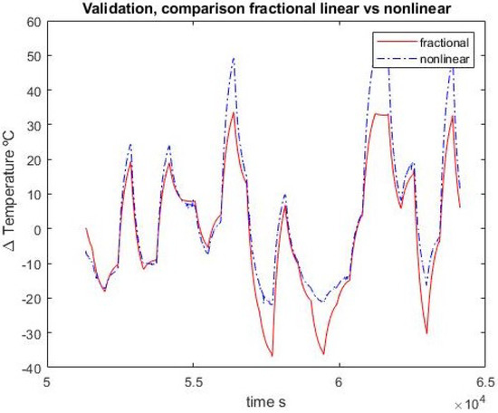Figure 4, Figure 5, Figure 6, Figure 7, Figure 8 and Figure 9 show the comparison between the ordinary model and the fractional one for the first-order approximation, with respect to experimental data of both identification and validation sets, and between each other. Figure 10, Figure 11, Figure 12, Figure 13, Figure 14 and Figure 15 show the comparison between the ordinary model and the fractional one for the second-order approximation
