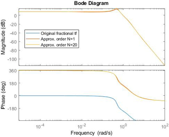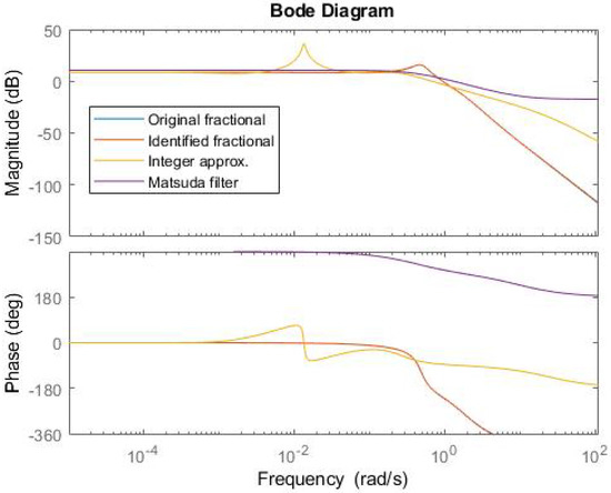 Finally, the Oustaloup’s and Matsuda’s filters are obtained to approximate (25). For the first one, the function oustapp from the FOMCON toolbox is used. We set the coefficients to be bounded in [, 10] and the order of approximation to be equal to . Oustaloup’s approximation is quite cumbrous, too much to report it here; it suffices to say that it has 262 terms. A significant reduction can be obtained by reducing the order of approximation in the Oustaloup method. Nevertheless, even reduced to the minimum , the default is , a transfer function with 18 poles and 15 zeroes is obtained. The bode diagrams of both approximations are very close both for magnitude and phase, as seen in Figure 17, where they are also compared with the Bode diagram for the original fractional transfer function (25).