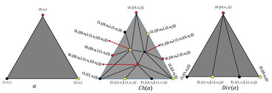 As showed in Figure 2, on the left side of this figure is a chromatic 2-simplex with colors , and in the middle of it is a once standard chromatic subdivision of , and on the right is a general chromatic subdivision of , since it is easy to check that it does not satisfy the second condition.