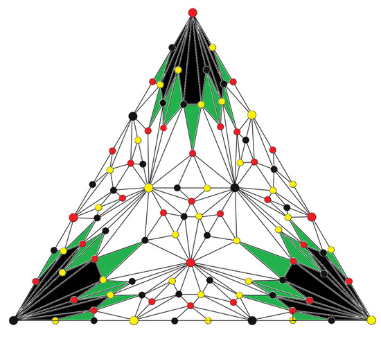 The -neighborhood describes a combinatorial adjacent relation of two facets in , which is not a neighborhood in the usual sense in topology or geometry. In general, a neighborhood of a facet in the triangulation of an n-manifold is equal to the union of facets in itself and its collar, which is indeed not its -neighborhood. Seeing Figure 3, let X be the black fields, the collection of all the facets of the star of in , the green areas are the -extended of X, and the -neighborhood is the collection of all the 2-simplexes colored black and green.
