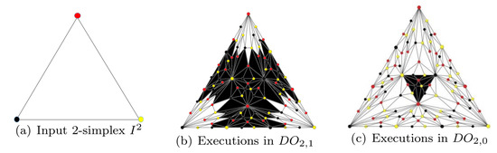 Consider an execution in delayed object with an input 2-simplex = , where the colors red, black and yellow are corresponding to , and , and is the input value of the process , seeing the left side of Figure 4. Each 2-simplex colored black in the middle and the right of Figure 4 corresponds to a possible execution for and , respectively. Comparing Figure 3 and the middle of Figure 4, it can be seen that each black 2-simplex in the middle of Figure 4 is a 2-simplex of .