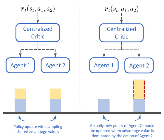 The schematic diagram of two agents with shared advantage function. The centralized critic would mislead the policy update to when we train the agents with finite samples as the left part of this figure, while it is correct by only updating the policy of Agent 2 as the right part.