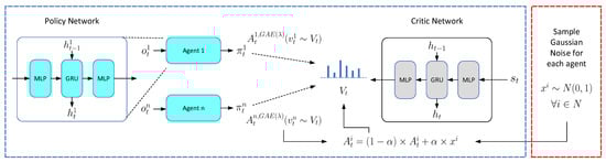 We describe the model diagram and the omitting pseudo-code of NV-MAPPO in this section, the complete code can be found in https://github.com/hijkzzz/noisy-mappo (accessd on 7 January 2022).