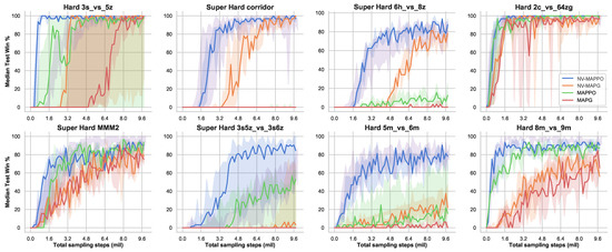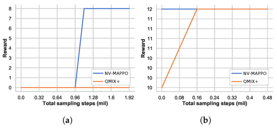 First, we evaluated NV-MAPPO on a non-monotonic Matrix Game to verify the expressive capacity of the centralized value function. These two different payoff matrices in Table 1 are both used to test the cooperative ability that deals with the Relative Overgeneralization problem. The results in Figure 4a,b show the superiority of the NV-MAPPO since it could find the optimal joint-action faster even when we implement the fine-tuned version of QMIX (QMIX: https://github.com/hijkzzz/pymarl2 (accessed on 8 August 2021)) [37] (represented by QMIX+ in figures below), which also achieves the state-of-the-art level in SMAC and other cooperative tasks.