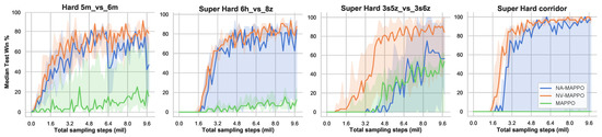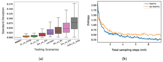 Since the proposed noises are not injected into policy network similar to [17,18], they will not directly affect the actions that agents take. Therefore, we explore the reason why these noises could regularize the policies of agents under CTDE paradigm. We calculate the average entropy of the policies of the agents in scenario 3s5z_vs_3s6z, which has the largest variance across all the testing environments. As shown in Figure 7b, the entropy of MAPPO’s policies continuously drops as the training goes on; however, for NV-MAPPO, the entropy would drop at the beginning of training as usual, and then keep fluctuating in a small range. This peculiarity would maintain the entropy in agents’ policies higher than that of MAPPO, and hence give rise to more exploration. We think that the fluctuation of centralized critic induced by injected noise will indirectly regularize the policies through gradient backpropagation along with actor–critic architecture. This could explain why the proposed noise-injection method would greatly improve the performance of MAPPO in Super-Hard scenarios that are hard to explore the optimal joint actions of agents.