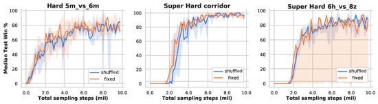 We implemented all the algorithms in the PyMARL framework [35], and used the same network architecture and hyperparameters for those contrastive methods. Since we selected MAPPO as a representative of the MARL actor–critic style algorithm, the hyperparameters are heavily based on the recent paper [28], which fine-tunes the MAPPO (MAPPO: https://github.com/marlbenchmark/on-policy (accessed on 5 March 2021)). Yu [28] proposes several agent-specific features screening methods to enhance the performance of vanilla MAPPO. It is worth noting that we strip off these artificial features of MAPPO in [28] as testing baseline. Each agent is equipped with a DRQN [36] with a recurrent layer, which has a 64-dimensional hidden state. We set the discount factor and for all testing scenarios (there is a noticeable difference between the different versions of SMAC, we use SC2.4.10 version of SMAC through all the testing scenarios).
