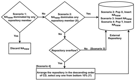 On the other hand, in a multi-objective optimization (MOP) with competing objectives, there is no single best solution. The interplay of several objectives results in a collection of compromised solutions, which are sometimes referred to as trade-offs, non-dominated, non-inferior, or Pareto-optimal options. A fitness comparison is used to establish a candidate’s superiority over other alternatives in an SOP. Despite this, the idea of dominance is used in MOP to assess the merit of a potential solution. If the following two requirements are true, a solution in the feasible region of a C-objective problem dominates another solution, .