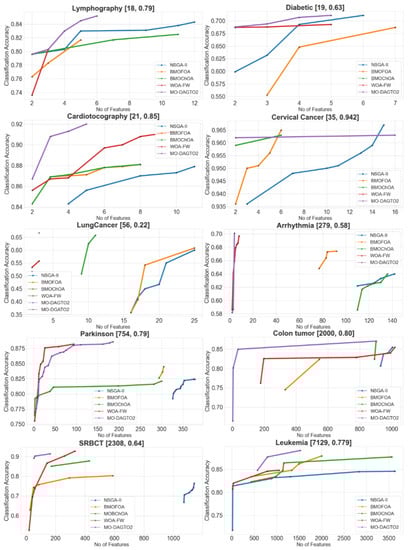 - Among all the above discussed multi-objective FS strategies, MO-DAGTO2 has the greatest contribution toward discovering the true Pareto front as the SCC values are very impressive in most of the datasets. This indicates its rapid convergence toward the optimal solution set.