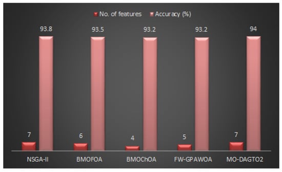 Figure 6 illustrates the accuracy and feature size of the suggested MO-DAGTO2 and the other four multi-objective techniques. It can be shown that MO-DAGTO2 attained an excellent classification accuracy of by using only seven factors, which are sex, number of weeks between earliest date and date of symptom onset, known exposures, country, process, underlying conditions, and patient’s age group. The classification results of before and after FS with the utilization of MO-DAGTO2 method are listed in Table 12. Here, the RF classifier outperforms the other classifiers by achieving classification accuracy equal to , while considering only seven out of 18 features.