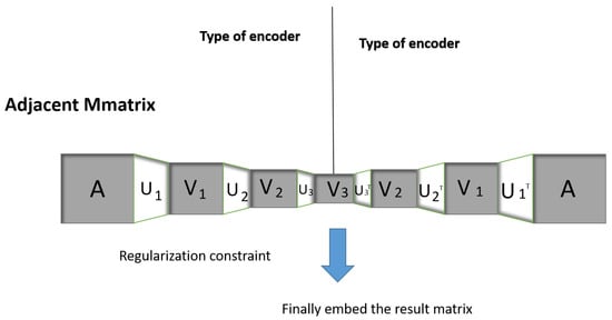 It can be seen that Formula (1) is a reconstruction of the original network corresponding to the decoder part of the autoencoder. To improve the representation learning capability of the auto encoder, the encoder components must be integrated into the community detection model based on NMF to form the NMF model similar to the autoencoder. The rationality of the NMF model of class automatic coders is quite simple. For the ideal basis matrix , it is supposed to be able to reconstruct the primal network by reconstructing the mapping with a small error; meanwhile, it should be able to precisely project the primal network to the community membership space by the help of the mapping , that is, . Integrating the encoder component and the decoder component with a unified loss function allows them to know each other during the learning process, from which we can obtain the ideal community members of the node. To accomplish this vision in the depth model, the objective function of the encoder is as follows.