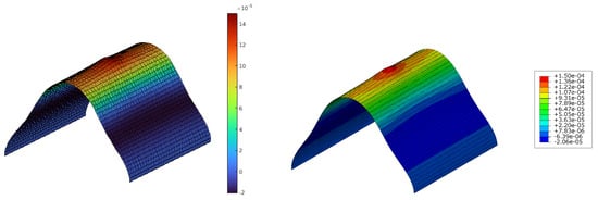 The domain is defined as a semicylindrical shell. The dimensions are m and m with a global thickness of m. The Young’s modulus of the material is set to Pa and the Poisson’s ratio to .
