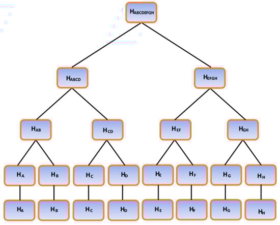 Blocks in the blockchain contain two sections: a header section containing the block hash, the timestamp, and the hash of the previous block, and another section containing the transactions collected by the block′s miner. In the case of Bitcoin, the header section contains the nonce used to compute the hash, an additional field called the Merkle Root, and the transactions are arranged in a Merkle tree structure. The Merkle tree is a type of tree wherein the lower base elements are called leaves and the top element is called the Merkle root. Each leaf node is a hash of a particular transaction within the block, and each non-leaf node is a hash of its two children, as shown in Figure 1. Merkle trees are used for simplified payment verification. If the transactions are not organized in a Merkle tree structure, to verify that a particular transaction is in a particular block, a user would have to download all the transactions in the block, output the corresponding hash, and compare it with the block hash. Thus, for a block with transactions, the user would have to download transactions. On the other hand, if the transactions are organized in a Merkle tree structure, to check a single transaction, the user would only need the hashes that route his transaction to the Merkle tree. Moreover, for a block with transactions, the user would only need to download elements.