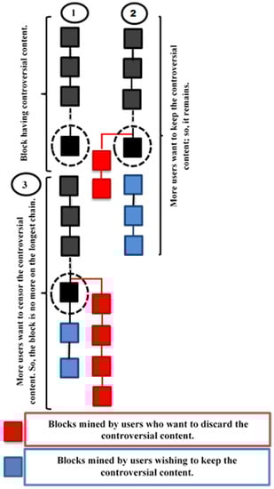- It enables a censorship-free network, as depicted in Figure 2; this is because any data that are shared to the blockchain are unchangeable and unerasable. Indeed, for any content to be dismissed, new blocks need to be added to the block that precedes the one containing the undesirable content until that block is ingratiated into a smaller branch that can be bypassed [20].