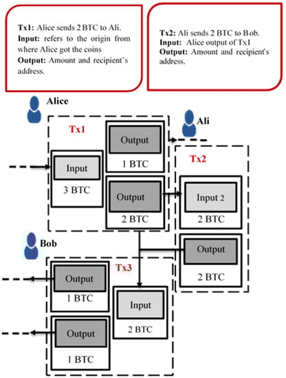 It would be unfair to mention blockchain technology without discussing smart contracts. Smart contracts are computer codes that specify the terms of agreement between two or more parties, and they must be confirmed by network members [29]. These computer programs (protocols), which are published on the blockchain, are used to enable credible transactions that can be conducted without a third party. These transactions are trackable and irreversible [30]. In 1994, smart contracts were first proposed by Nick Szabo, who first coined the term, and later, this became a generic term associated with Bitcoin. Indeed, Bitcoin allows a script to be added to any transaction to set or fulfil a condition [31]. Bitcoin transactions must have a specific format called Unspent Transaction Output (UTXO), and they must contain an input and an output [8]. Figure 3 illustrates Bitcoin transactions in an UTXO format. For example, if Alice issues a transaction in which she sends three Bitcoins to Ali, the input for this transaction is three Bitcoins, and as an output, the transaction notes that these three coins are for Ali. If Ali wants to use these Bitcoins and send them to someone else, the input of the transaction must reference Alice′s transaction output so as to trace the coins to their point of origin. In the same manner, Alice′s transaction to Ali must have its input point reference the transaction output as the origin point from which she received those coins. This ripples back until a coin base transaction is detected; this kind of transaction offers the mining reward to the deserving miner node, and it has no input. This input–output format makes it possible to verify any set condition or specification as a script, thus affecting the circumstances concerning the transfer of the coins. For example, if Alice has set a condition for her transaction, stating that the coins she is transferring can only be spent two months after the transaction issuing date, as Ali would have to reference Alice′s transaction output in the input of his transaction, anyone can thus check the predefined conditions, and accordingly approve or deny that transaction. Given that the coins cannot be issued until two months after the transaction date, anyone can check whether Ali is allowed to spend the coins, and therefore, whether they should accept the transaction or not.