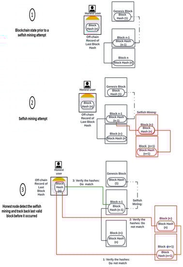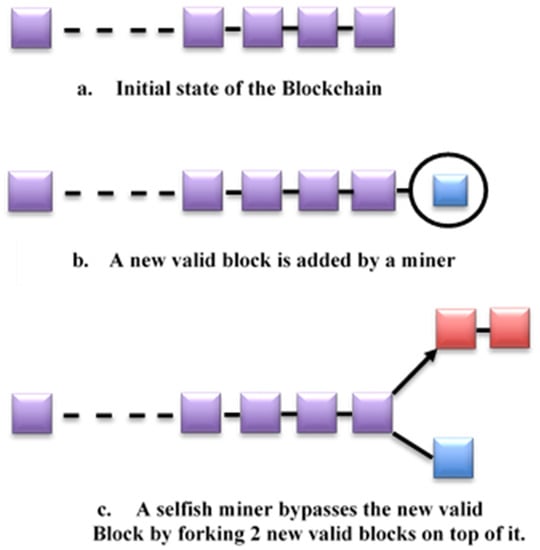 - Selfish mining: if a party (miner or miner-pool) is sure that they can mine newly created blocks at least two times faster than any other node in the network, they may be partaking in what is called selfish mining. Selfish mining occurs when strong nodes can withhold blocks, which they create, and selectively postpone their broadcast. As a result, a fork is deliberately generated in a chain that would have otherwise been the longest chain, and consequently, this might force the honest network to discard some of its blocks [44,45]. Thus, selfish mining is one such downside of the “longest chain wins” principle, as illustrated in Figure 6.