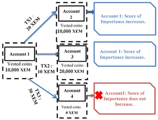 With Proof of Importance algorithms, which are used by NEM [62], each account is assigned an importance score that represents its acquired importance to NEM. The nodes which have the highest importance score, have more opportunities to reap a block. In the case of NEM, the importance score is computed depending on the amount of vested money, which is equivalent to the amount of money that has been staked. NEM requires a balance of at least 10,000 vested XEM (XEM is the cryptocurrency enabled by NEM) to be able to harvest, which is supposed to limit the number of accounts that are expected to fall victim to Sybil attacks. In addition, such attacks are unlikely in PoI, thus causing transfers to decay over time, as only 10% of this amount can actually be vested by the network in 24 h. Accordingly, it would require ten days to vest 10,000 XEM, whereas several weeks are needed to ensure that inflows are fully vested into an account. Despite implementing these countermeasures against Sybil attacks, PoI still suffers from the “nothing at a stake” problem [63]. In PoW, mining a new block on both chains forces the node to split their hashing power by two, in spite of the risk of losing the mining race, and in addition to wasting energy and hashing power for nothing. Conversely, any time a validator is confronted with a fork, they can simply add their new block to both chains. Consequently, the network will end up with two chains of the same length, wherein coins may be double spent [60]. Figure 9 illustrates the importance score in PoI algorithms. Table 1 provides the major advantages and disadvantages of Proof of Stake-based algorithms, whereas Table 2 shows the top ten cryptocurrencies of 2022 in terms of market capital, in addition to the corresponding consensus protocols used for those cryptocurrencies.