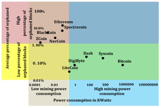 Percentage of orphaned blocks per day versus power consumed during block mining in blockchain-based cryptocurrencies, colors are used to demonstrate that blockchain located in high percentage of orphaned block zone intersects with the low mining power consumption zone and vice versa.