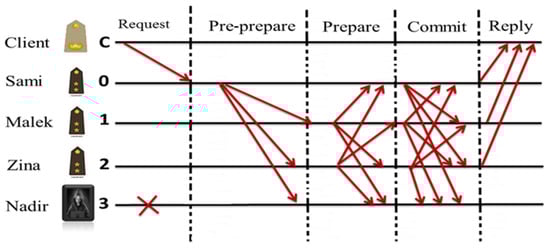 - Castro, M.; Liskov, B. Practical Byzantine fault tolerance. In Proceedings of the Third Symposium on Operating Systems Design and Implementation, New Orleans, LA, USA, 22–25 February 1999; pp. 173–186. [Google Scholar]