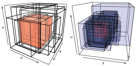 To display this information, Figure 2 represents the sets of maximum and minimum depth. In particular, the left panel of the Figure represents the five deeper cuboids, with the sets of maximum depth colored in red. Meanwhile, the right panel of the Figure represents the sets with minimum depth in color blue. That is, those in (18). In addition, the right panel of the figure also displays C 1 , the cuboid with maximum depth, in red. This is completed in order to visualize that the ordering given by the Tukey depth is natural, and the element C 1 is the deepest set with respect to the cloud of cuboids.