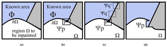 Divide the image to be repaired into a known area and a region to be inpainted in Figure 2a. Set as the front of fill area. In Figure 2b, taking point p () as the center, the region defined by . With as the target matching region, match similar regions on the boundary between two textures in a known region, such as , in Figure 2c. Finally, select the best matching region for filling in Figure 2d.