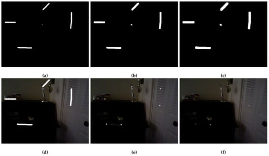 Results of the FMM combined with the image dilation. (a) Original mask. (b) The first dilation mask. (c) The second dilation mask. (d) Original image. (e) The first dilation result. (f) The second dilation result.