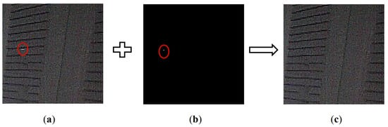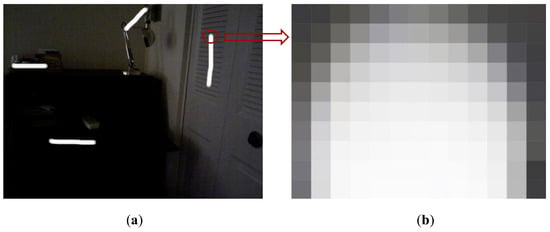 The common damage of images, such as vertical scratches, scratches of any shape, and dust, seriously affect the quality of images. The vertical scratch is a kind of continuous damage, strip shape. The pixel value of the damaged area is attenuated chord distribution, that is the pixel value of the damaged area decreases with the increase of the distance from the center area [], as shown in Figure 9. Here, we artificially created images with vertical scratches, as shown in Figure 10a. Figure 9b is the magnification effect diagram of the damaged area boundary in Figure 9a.