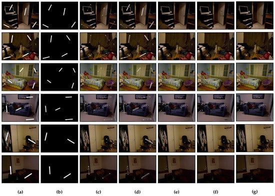 In view of the situation that the pixels of the image are lost due to the vertical scratches (as in the mask, the FMM method, and BBIM method), we use morphological analysis optimizations and update the masks by dilation and sharpening. After processing, the effect of image restoration is more ideal, such as in Figure 10e,f. We also use PSNR to represent the results of image inpainting, as shown in Table 2.