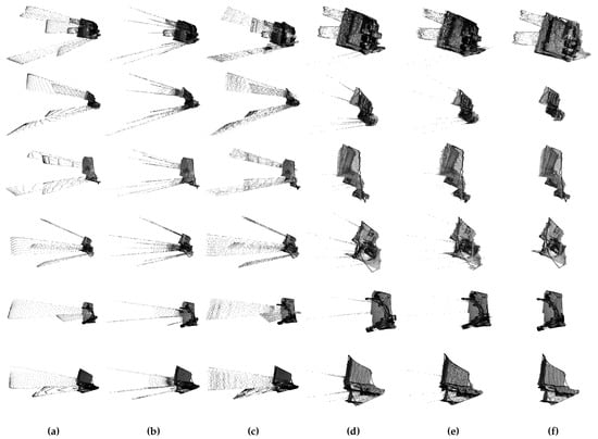 Left view of pointcloud. (a) Tthe original pointcloud. (b) The pointcloud of FMM. (c) The pointcloud of BBIM. (d) Ours (based on FMM). (e) Ours (based on BBIM). (f) Ground truth.
